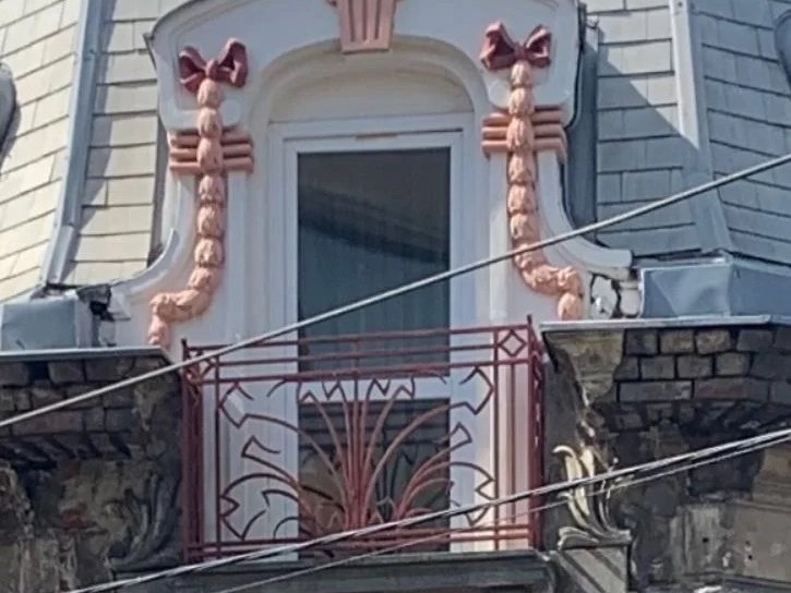 The main façade doesn't face the street directly — an unusual architectural choice for Bucharest, which gives the building a slightly withdrawn, almost discreet air. A small balcony added later, with pink ribbon ornaments in its décor, brings a whimsical, domestic note — a sign that someone truly lived here and wanted to leave a personal mark on the wall. The plant ornaments on the exterior continue the interior logic of the stained glass: nature stylized into decoration, unmistakably Art Nouveau.