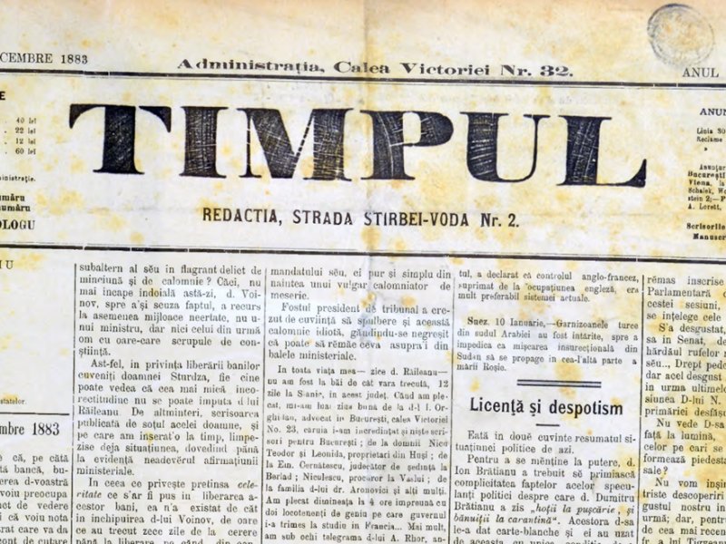 A total of 149 years ago, on March 15, 1876, the Conservative Party newspaper Timpul (“The Time”) appeared in Bucharest, initially published four times a week between 15 March and 16 May 1876, then daily between 17 May 1876 and 17 March 1884, later from 13 November 1889 to 14 December 1900, and finally in its last series from 2 March 1923 to 7 July 1924. Among its most renowned editors were Mihai Eminescu, Ioan Slavici and I. L. Caragiale.