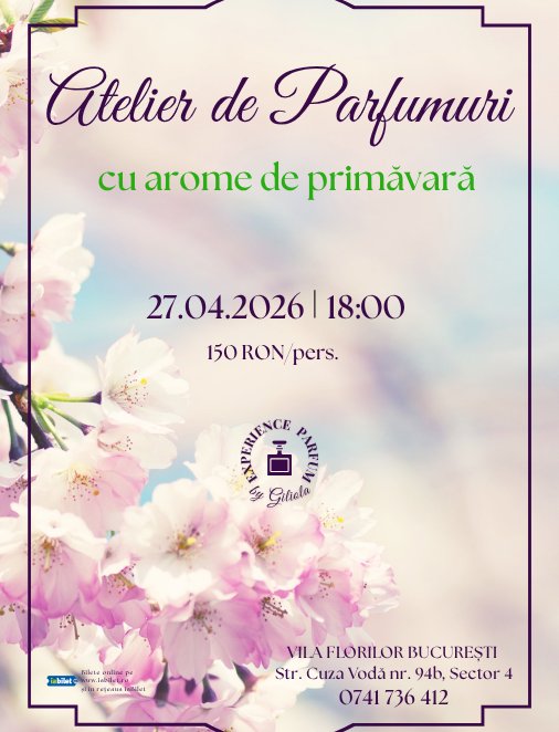 Dacă vrei să încerci ceva nou și să vezi lumea parfumurilor „din interior”, te așteptăm la atelier! Detaliile despre înscriere sunt pe afiș.