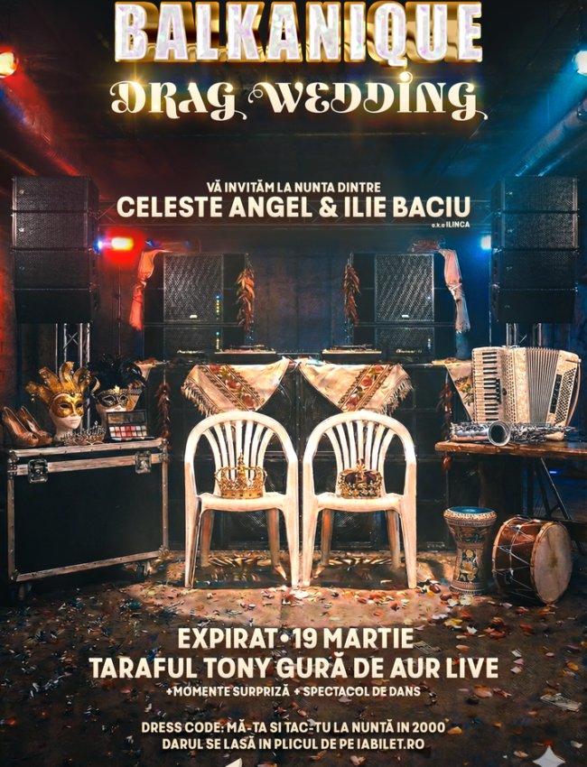 Singura nuntă la care îți dorești cu siguranță să ajungi anul acesta are loc chiar în Expirat, pe 19 martie. E o nuntă cu de toate, mai puțin cu scandalul de la final dintre rude. În rest: drag show, lăutărie live cu Taraful Tony Gură de Aur, aruncatul buchetului, momente de dans & party, aperitive, chiuituri. Voie bună, veselie, văleleu!