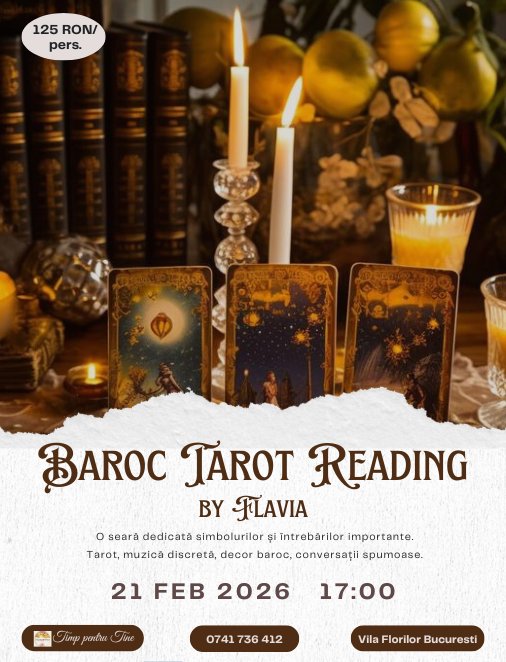 Evenimentul propune o întâlnire într-un spațiu elegant, cu identitate vizuală clară, unde tarotul este elementul central al serii.