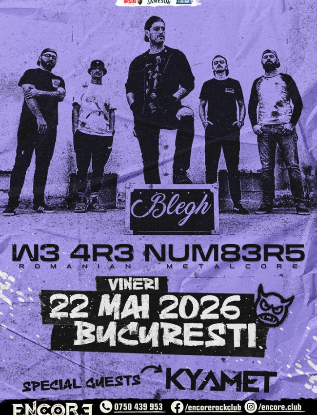W3 4R3 NUM83R5 din Brasov este o prezenta solida in scena Metalcore din Romania, activa fara pauza din 2014. Trupa combina riff-uri grele, parti melodice si breakdown-uri dure, iar live-urile sunt mereu pline de energie. Au cantat la festivaluri importante din tara si au urcat pe scena alaturi de At The Gates, Carnifex sau Comeback Kid. In 2024 au marcat 10 ani de activitate cu albumul „Death Finds A Way”, lansat printr-un concert sold-out la Rockstadt.