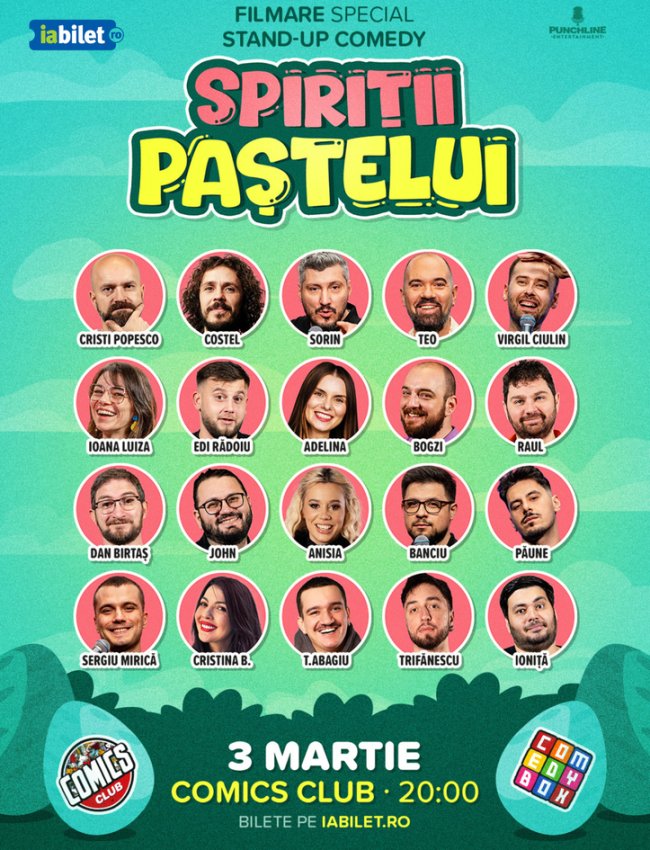 Paște cu hohote de râs la Comics! Anul ăsta lăsăm cozonacul deoparte și punem râsul pe masă! Te invităm la un show SPECIAL de stand-up comedy de Paște, unde simbolurile sărbătorii prind viață și sunt pregătite să te facă să râzi, așa cum meriți! Iepurașul nu mai aduce doar ouă, ci glume pe care nu le-ai auzit niciodată la masa de Paște, iar mielul are foarte multe de spus. Vino să sărbătorești Paștele altfel: cu stand-up comedy, personaje tematice și porții zdravene de comedie, nu de ouă umplute. Va fi delicios! Acest eveniment va fi filmat. Prin achiziționarea biletului, îți dai acordul și iei la cunoștință că este posibil să apari și tu prin cadru. Locurile sunt limitate!