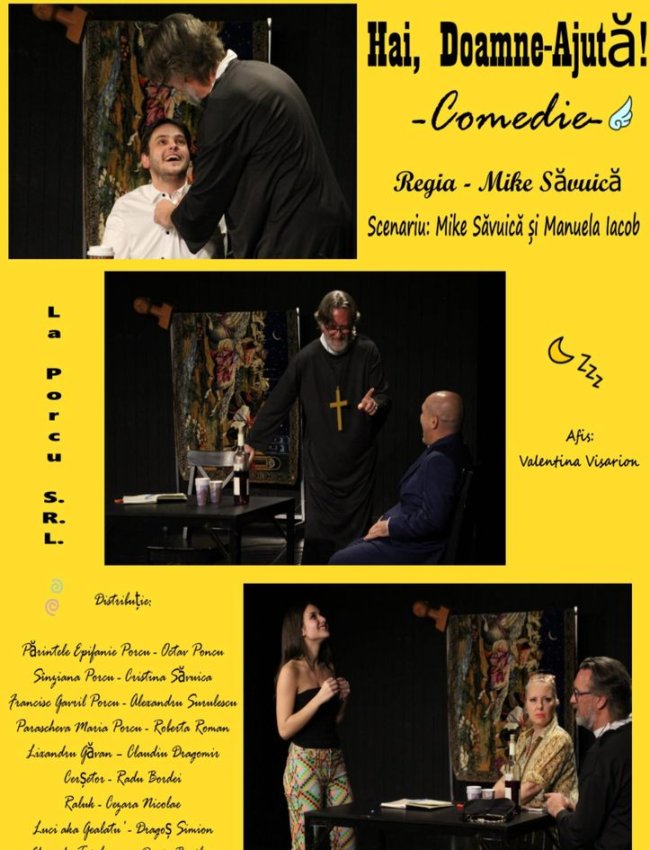 Părintele Epifanie Porcu - Octav Poncu, Sînziana Porcu - Cristina Săvuica, Francisc Gavril Porcu - Alexandru Surulescu, Parascheva Maria Porcu - Roberta Roman, Lixandru Găvan – Claudiu Dragomir, Cerșetor - Radu Bordei, Raluk - Cezara Nicolae, Luci aka Gealatu’ - Dragoș Simion, Gheorghe Tai-Lemne - Daria Brojban, Autori - Mike Săvuică și Manuela Iacob, Regia - Mike Săvuică.