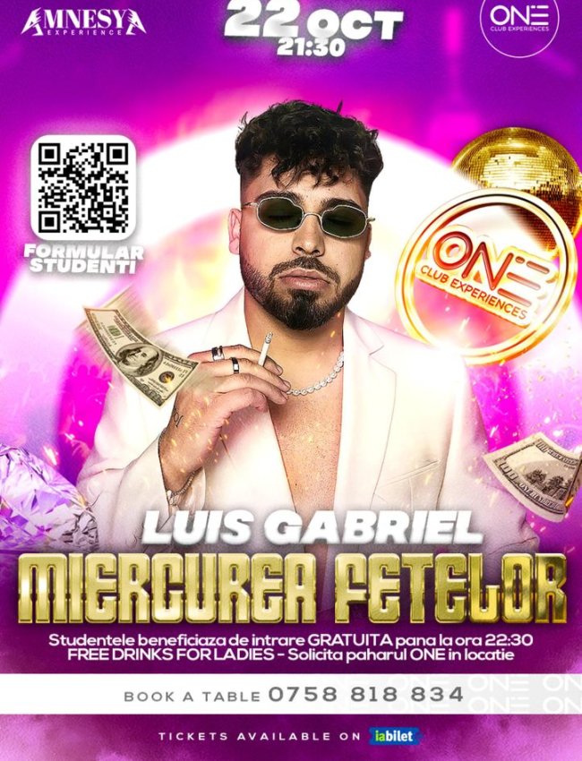 Pe 22 octombrie, de la ora 21:30, te așteptăm la One Club Experiences la o nouă ediție a conceptului „Miercurea Fetelor”, alături de Luis Gabriel.