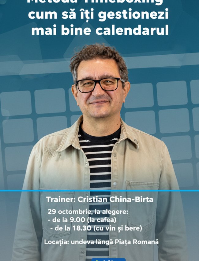 București, 22 octombrie 2025 — Cristian China-Birta organizează pe 29 octombrie un workshop dedicat metodei TIMEBOXING, un instrument practic pentru gestionarea mai eficientă a timpului și a calendarului personal sau profesional. Participanții pot alege să participe la una dintre cele două sesiuni:
