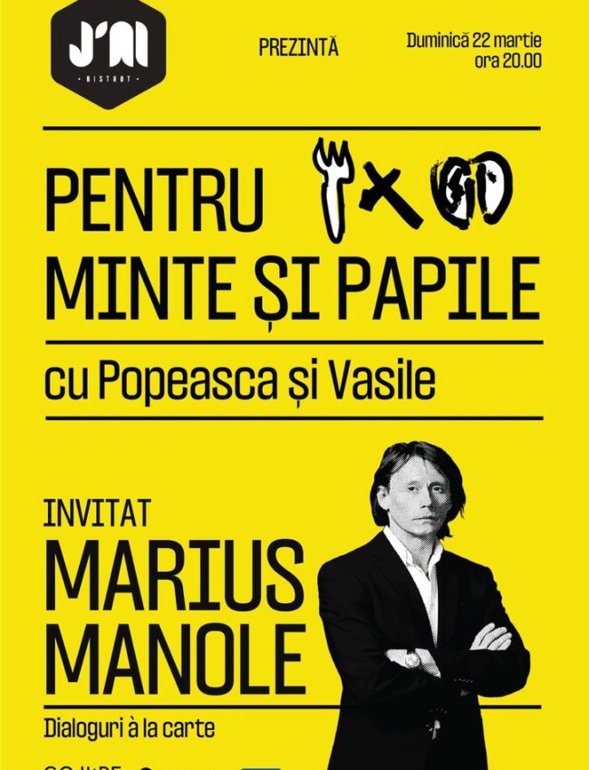Așa s-a născut seria "Pentru minte și papile", care debutează duminică, 22 martie, cu Marius Manole, pe care amfitrionii intenționează să-l chestioneze pe varii subiecte, de la profesia pe care o face la modul obsesiv și cartea recent lansată la microscopicul său timp liber și plăcerile culinare mai mult sau mai puțin nevinovate.
