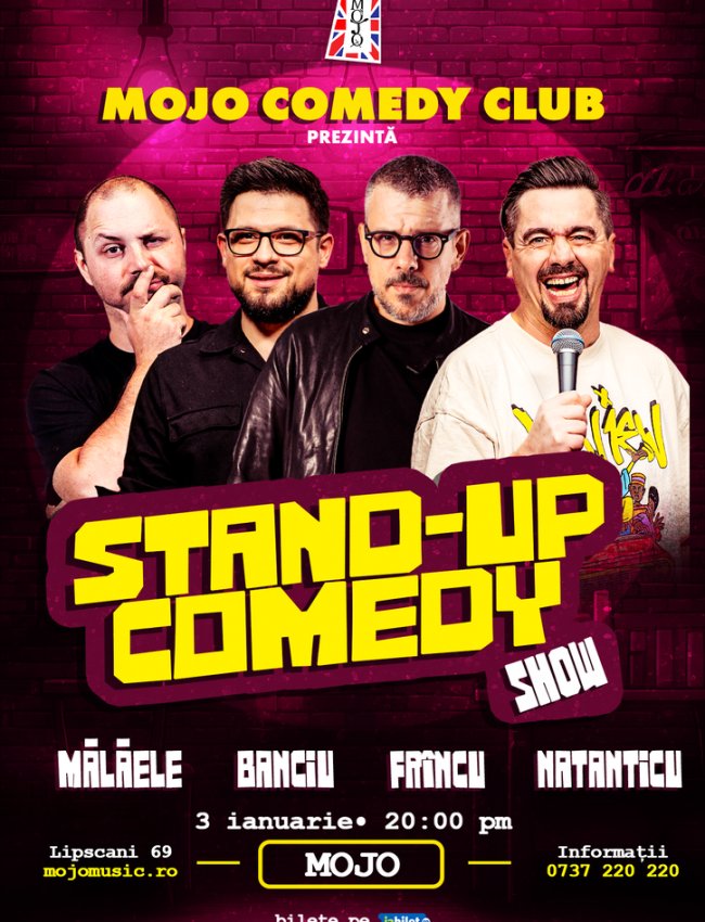 Pe 3 ianuarie, de la ora 20:00, Mojo Comedy Club te scoate din mahmureala de sărbători cu 4 grei ai stand-up-ului românesc, glume fresh și punchline-uri fără milă: