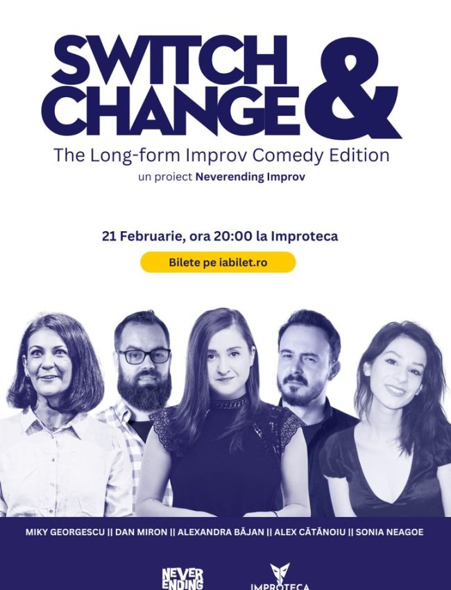 Detaliile organizatorice: Sâmbătă, 21 Februarie, de la ora 20:00 La Improteca, în Bucuresti, pe Comanita 9 Spectacolul va fi în limba română.Switch & Change - este un proiect inițiat de Neverending Improv șigăzduit de Improteca.